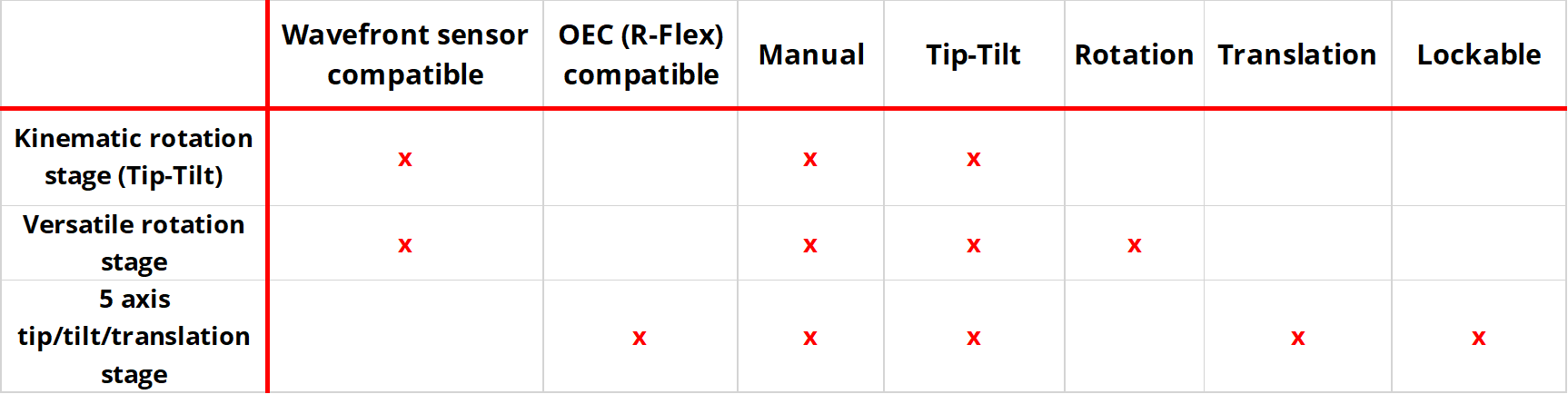 The mount stages are ready-to-use solutions for quick and easy alignment of your instrument. HASO and LIFT wavefront sensors need Tip-Tilt degrees of freedom while OEC R-FLEX metrology systems need X, Y, Z translations in addition.